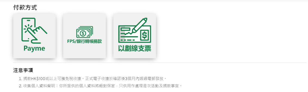 - 劃線支票:先在捐款表格輸入支票號碼,然後郵寄支票至「九龍長沙灣道 681 號貿易廣場 811-813室」。