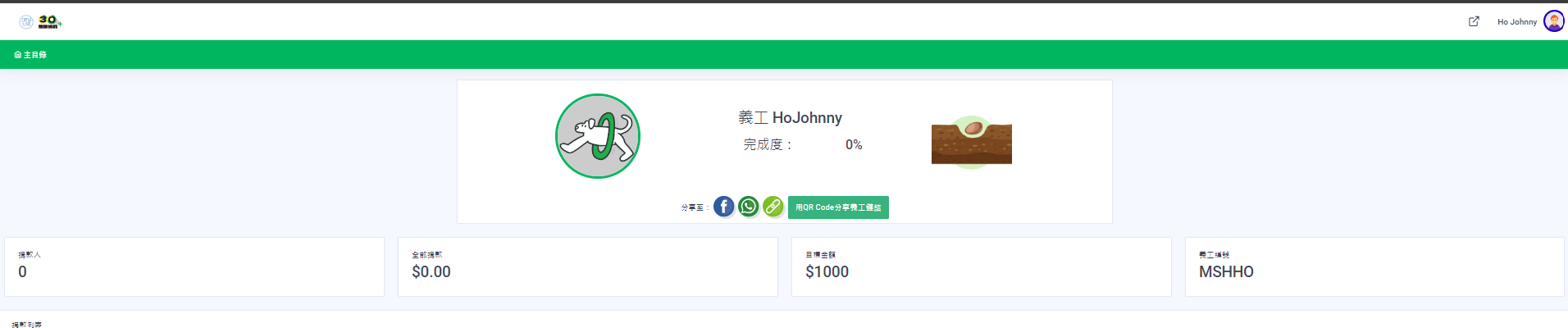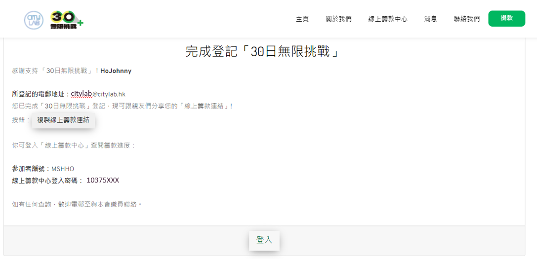 10. 登入後可進入您的「線上籌款中心」,查看你的籌款進度及捐款列表(顯示所有透過您的專屬連結進行捐款的捐款者